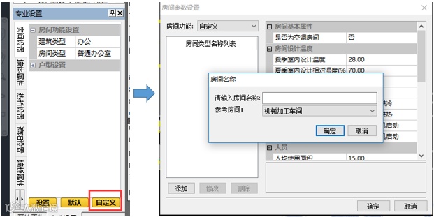 如遇到数据库当中尚未包含的房间,设计师可以选择功能相近的房间进行设置,也可以通过“专业设置-房间设置”自定义房间,注意选择参考房间时选择相近类型,确保室内扰量参数以及时间表设置合理。