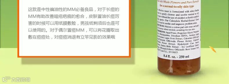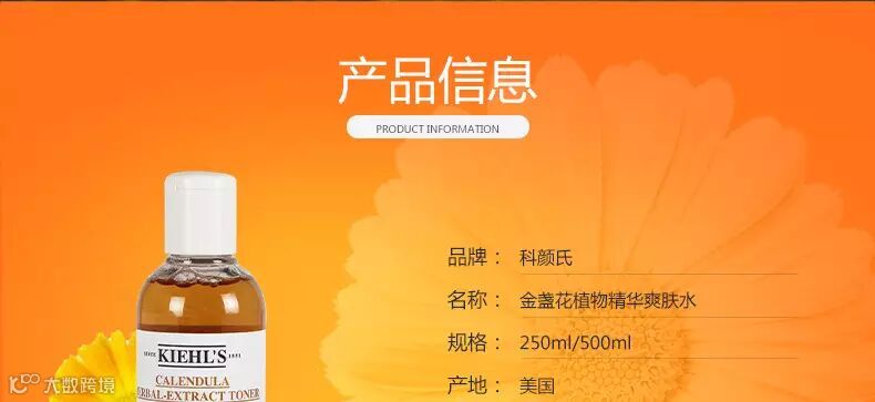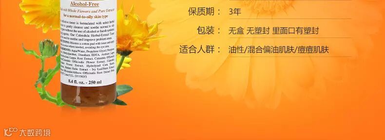 Kiehl s/契尔氏 限量版金盏花水,植物精华化妆水。化妆水里有金盏花瓣属正常现象 温和而不含酒精的植物萃取精华的化妆水,可有效均衡中性至混合性和油性的皮肤。完全萃取金盏花卉精华,有收紧皮肤的效果,也能改善皮肤过敏现象,或有助改善暗疮疤痕的愈合,亦适合男性剃须后使用。