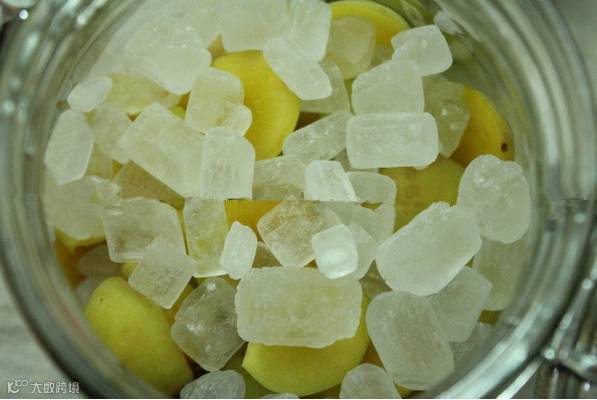 6.铺一层梅子果肉于冰糖之上,再铺一层冰糖,依次类推,重复此动作至瓶子九分满。