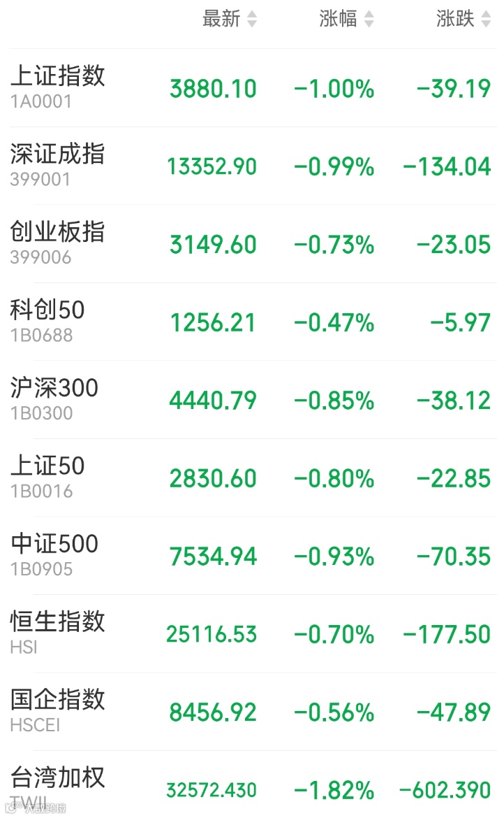 1、A股:A股高开低走,上证指数收跌1%报3880.1点,深证成指跌0.99%,创业板指跌0.73%,万得全A跌1.19%,市场成交额1.67万亿元,上日为1.86万亿元。CPO、光刻机、算力租赁、跨境支付、创新药概念股表现较好;煤炭、油气、养殖股下跌。上周,上证指数累计跌0.86%,深证成指跌2.96%,创业板指跌4.44%。