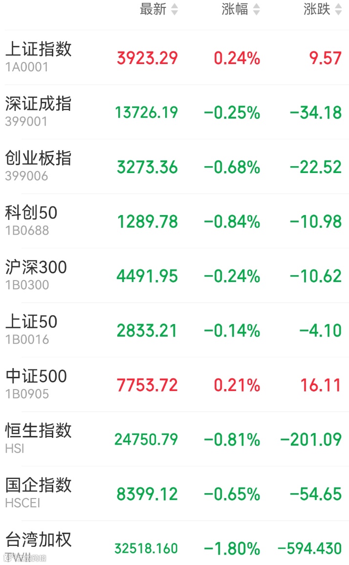 1、A股:A股探底回升,上证指数收涨0.24%报3923.29点,深证成指跌0.25%,创业板指跌0.68%,万得全A涨0.05%,市场成交额1.93万亿元,上日为1.86万亿元。有色金属板块爆发,铝业股、农业股涨幅居前,创新药、机器人概念局部走强;电力股跌幅明显,光伏产业链走弱。