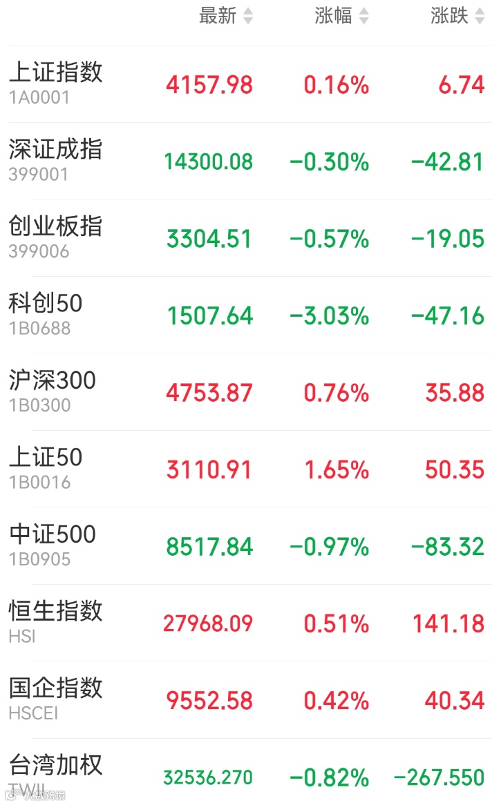 1、A股:A股延续窄幅整理态势,上证指数收涨0.16%报4157.98点,深证成指跌0.3%,创业板指跌0.57%,北证50跌1.69%,万得全A跌0.23%,市场成交额扩大至3.26万亿元。白酒股迎来久违大涨,泸州老窖、五粮液、山西汾酒等近20股涨停,贵州茅台大涨逾8%。黄金、油气、地产板块走强。半导体、商业航天、人形机器人下跌。