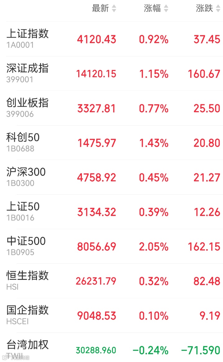 1、A股:上周五A股放量上涨,上证指数豪取16连阳站上4100点,刷新逾10年新高。市场成交额超3.1万亿元,为A股史上第六次成交额突破3万亿。截至收盘,上证指数上涨0.92%报4120.43点,深证成指涨1.15%,创业板指涨0.77%,万得全A涨1.18%。盘面上,影视、短剧游戏等AI应用方向集体爆发,小金属、商业航天、人形机器人概念走强;光伏产业链局部走弱,脑机接口概念股回落。