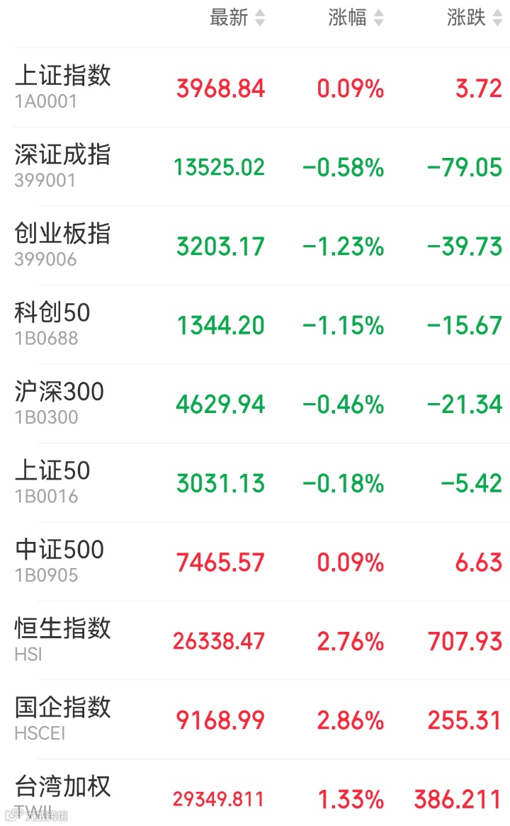 1、A股:上证指数报3968.84点,上涨0.09%,成交额8295.12亿。深证成指报13525.02点,下跌0.58%,成交额12157.23亿。创业板指报3203.17点,下跌1.23%,成交额5491.26亿。总体上个股涨跌家数相当。回望全年,两市总成交额超400万亿元,同比增长超六成,创历史新高。沪指2025年累计上涨逾18%,深证成指上涨近30%,创业板指上涨近50%。盘面上,CPO、存储芯片、商业航天、有色金属全年领涨;铁路公路、白酒、出版、中药等板块跌幅居前。