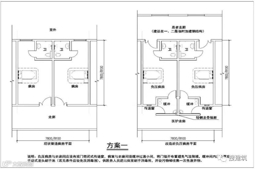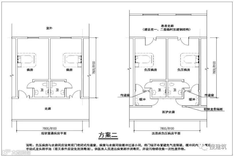 负压病房每间设置独立的卫生间,在医护走廊与病房之间设置缓冲前室,设置非手动或自动感应龙头洗手池,墙上设置双门密闭式传递窗。