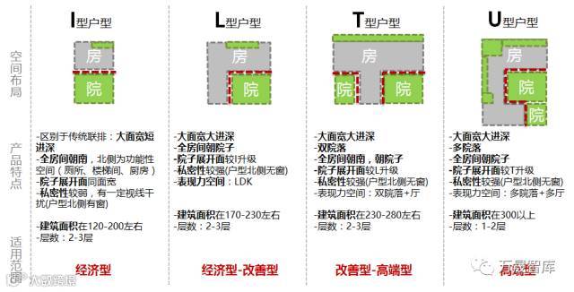 从下图可以看出,低层高密户型分化出I型、L型、T型、U型和F型五种典型平面形式,其中L/T/U/F以院落空间为平面的中心,公共性功能空间围环绕展开,客户的家人可以有各自的活动空间。临院可以借景入内,享受“对影看月,临窗听雨”的文人意趣。