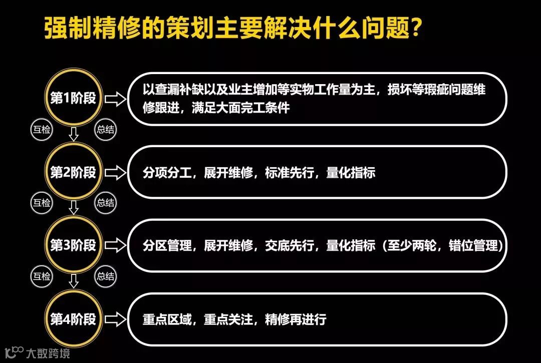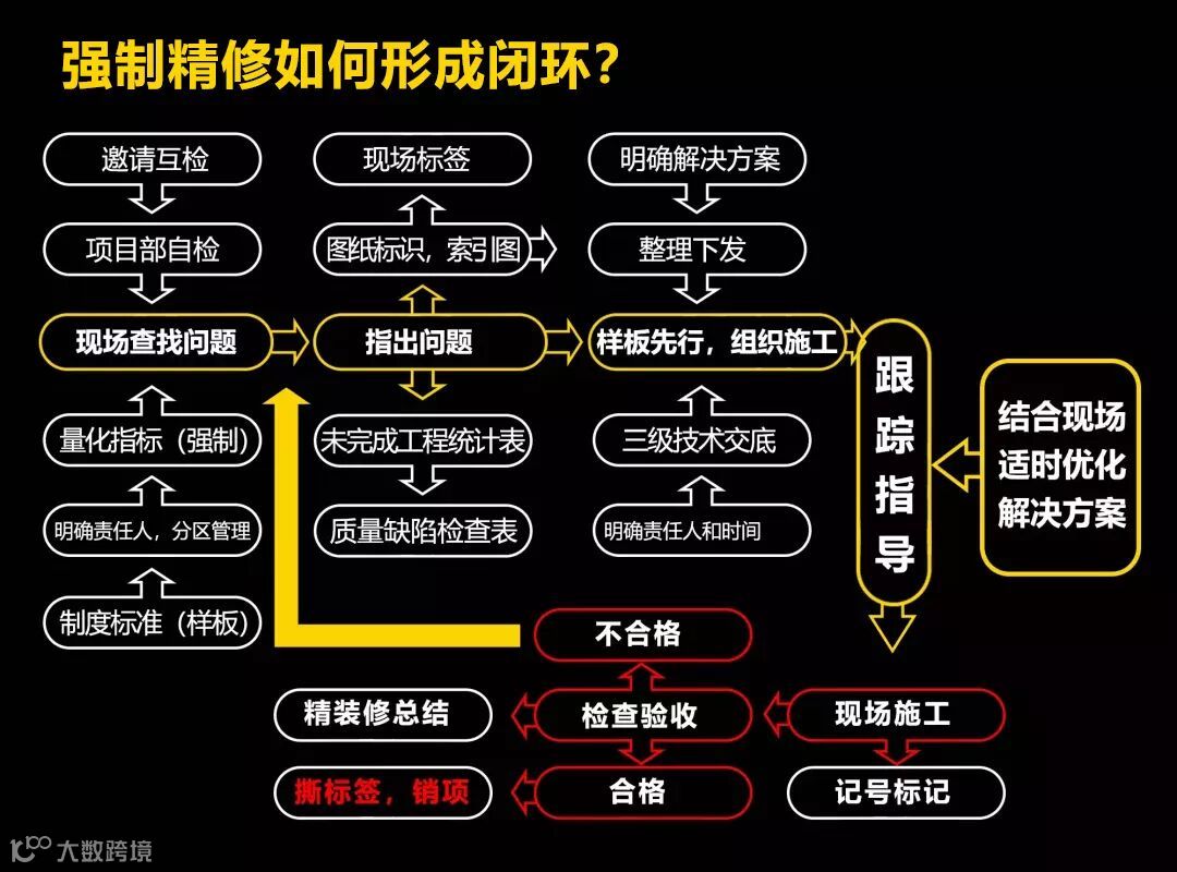 强制精修在项目上也俗称“变态精修、极致精修”,就是用严格的观感要求配合强制量化指标,去检查和发现现场项目存在的质量缺陷,以“零容忍”态度去解决存在的问题,最大化的提升产品质量的一种做法。