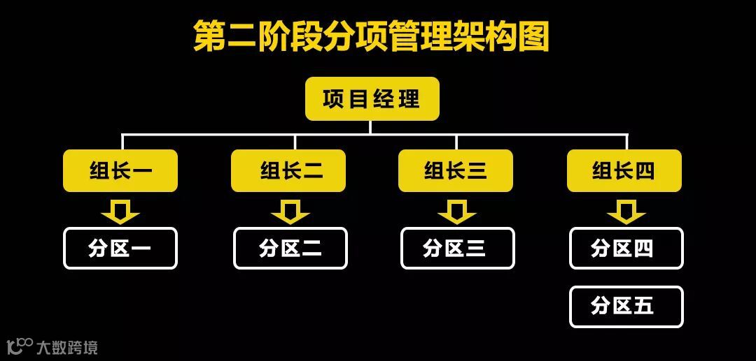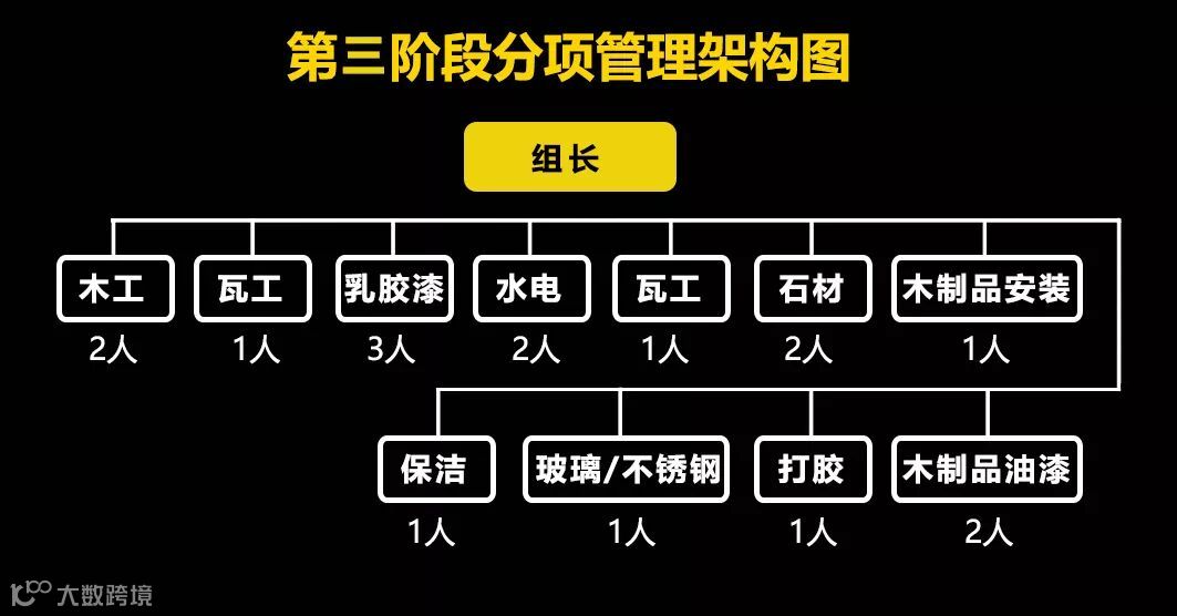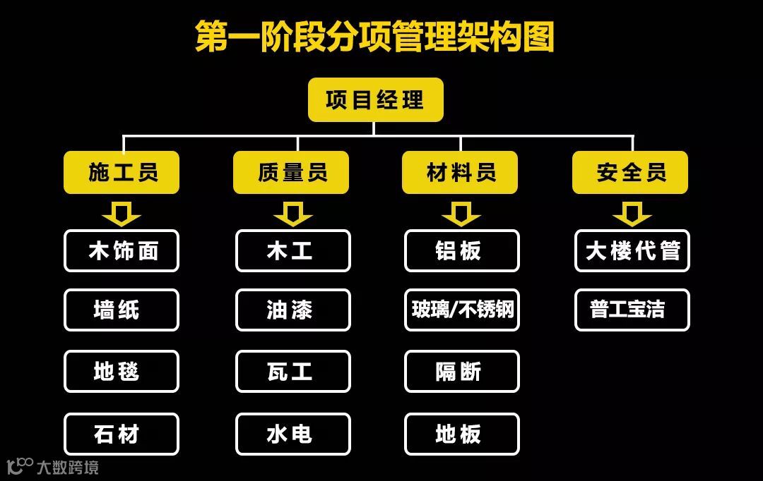 1. 第一阶段分项管理架构,由于第一阶段主要以收尾工作为主,为便于后期的资源调动,主要以分部分项的分工管理为主。