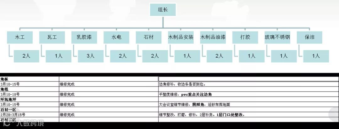 1. 精修小组组织架构(根据项目实际需要,合理确定组员的配备。考虑到产品化施工的要求,最好能找一专多能的维修工,同时能配备一名保洁人员收尾
