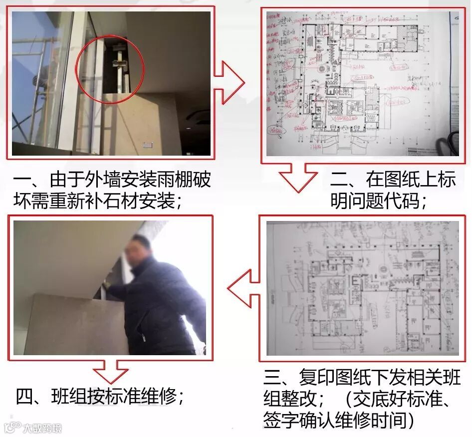 ■ 将标注好的现场问题图纸复印后下发到各个相关班组限期整改完毕;(此时对班组修改方法及精修标准需交底到位不能任其随意维修,签字确认后定期完成)