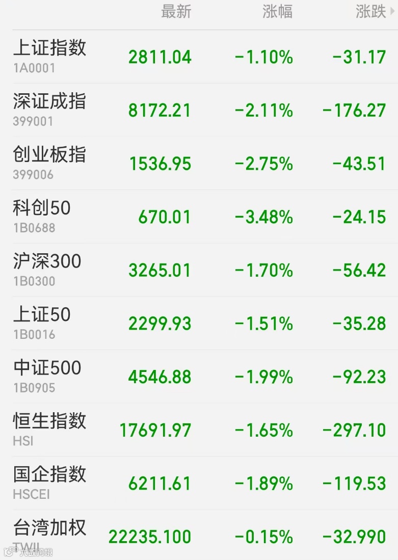 1、A股:A股三大指数低开低走,沪指创本轮调整新低,场内近4400股下跌。半导体概念股下跌,力芯微跌9%;中字头个股震荡下挫,中国船舶跌超9%;医药商业股走低,老百姓跌超9%;券商股回调明显,锦龙股份跌超8%;白酒股走低,五粮液、贵州茅台跌超3%。消费电子反复活跃,科森科技五连板,深圳华强录得13天12板;细胞免疫治疗概念走强,冠昊生物20%涨停;AI眼镜概念股回暖,卓翼科技涨停;煤炭股重拾升势,中煤能源涨逾6%,股价创15年新高。截至收盘,上证指数跌1.1%报2811.04点,深证成指跌2.11%,创业板指跌2.75%,科创50跌3.48%,北证50跌2.75%,万得全A跌1.78%,万得A500跌1.87%。市场成交额7084.7亿元。