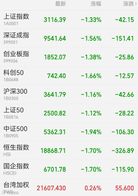 1、A股:A股三大指数低开低走,北证50逆势上涨,周期股全线回调,有色金属领跌;新能源概念股下挫。上证指数收跌1.33%报3116.39点,深证成指跌1.56%,创业板指跌1.38%,科创50指数跌1.66%,北证50涨1.68%,万得全A跌1.6%,万得双创跌1.76%。市场成交额8559.5亿元;北向资金净卖出32.66亿元。