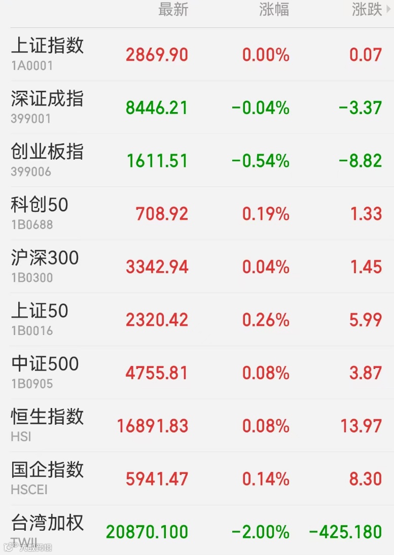 1、A股:A股冲高回落,种业、食品板块补涨大消费,ST股获热炒,医药股则显著回落。截至收盘,上证指数基本收平报2869.9点,深证成指跌0.04%,创业板指跌0.54%,万得全A跌0.06%,万得A500涨0.06%。市场成交额回升6200亿元,北向资金净买入11.03亿元。