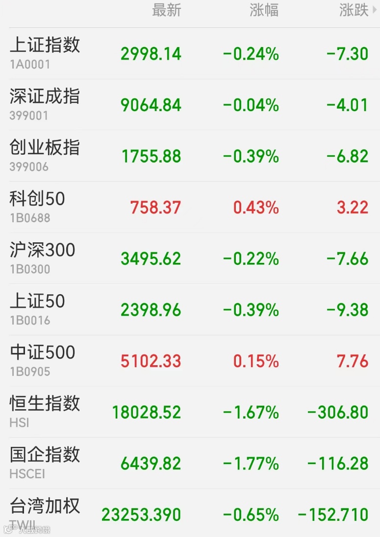 1、A股:A股三大指数缩量下跌,沪指失守3000点。截至收盘,上证指数跌0.24%报2998.14点,深证成指跌0.04%,创业板指跌0.39%,科创50涨0.43%,北证50涨1.48%,万得全A跌0.09%,万得双创跌0.24%。市场成交额6235.7亿元,创5个月新低;北向资金净买入0.04亿元,终结连续9日净卖出;中国中车获净买入2.8亿元最多,贵州茅台遭净卖出8.76亿元居首。值得注意的是,午后多只沪深300ETF快速放量走高,华泰柏瑞沪深300ETF收盘成交额超69亿元,嘉实沪深300ETF成交额超29亿元,均大超前一日成交额。上周上证指数累跌1.14%,录得周线五连阴;创业板指跌1.98%。