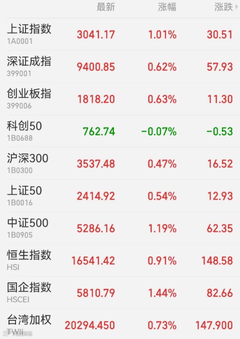 1、A股:A股三大指数集体上涨,黄金、石油等周期股大爆发,6G、小米汽车、汽车拆解等概念股表现活跃。截至收盘,上证指数涨1.01%报3041.17点,深证成指涨0.62%,创业板指涨0.63%,科创50指数跌0.07%,北证50指数涨0.35%,万得全A涨0.82%,万得双创涨0.81%。市场成交额8633.6亿元。上周,上证指数累计跌0.23%,深证成指跌1.72%,创业板指跌2.73%。