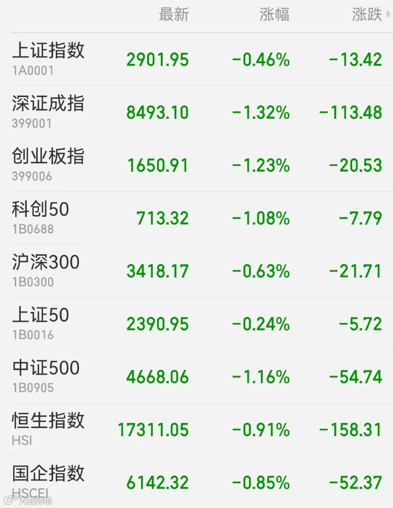 2、港股:港股延续跌势,恒生指数跌0.91%报17311.05点,恒生科技指数跌1.52%报3491.2点,双双创下三个月来新低;恒生中国企业指数跌0.85%,大市成交868.99亿港元。南向资金净卖出额为7583万港元。消费、科技、地产股跌幅居前。