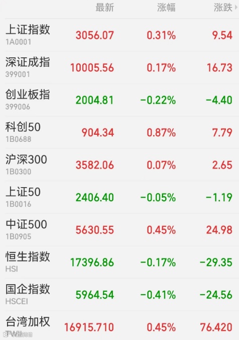 1、A股:A股延续横盘窄震格局,券商股冲高回落,热钱继续龟缩TMT,汇纳科技涨价带动算力板块继续向上,华为鸿蒙概念再掀涨停潮。上证指数收盘涨0.31%报3056.07点,深证成指涨0.17%,创业板指跌0.22%,北证50涨0.75%,万得全A、万得双创分别涨0.39%、0.69%。A股全天成交8962.2亿元;北向资金净卖出21亿元,中国平安遭净卖出5.11亿元。