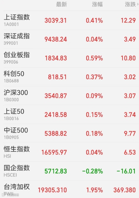 2、港股:港股三大指数全天宽幅震荡,恒生指数收涨0.04%报16595.97点,恒生科技指数跌0.38%报3474.77点,恒生国企指数跌0.28%报5712.83点。医药、能源股强势,新能源汽车、内房股领跌。大市成交1068.67亿港元,南向资金净买入36.63亿港元,美团获净买入8.39亿港元。中国台湾加权指数涨1.95%。