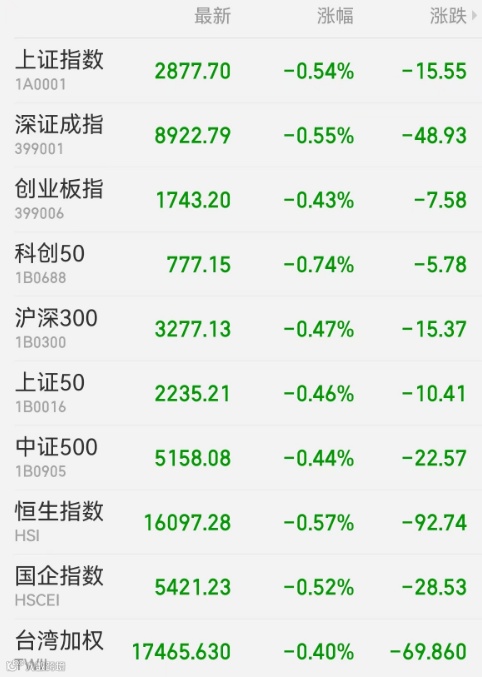 2、港股:香港恒生指数收跌0.57%,报16097.28点,连跌7日;恒生科技指数跌0.76%,恒生国企指数跌0.52%。消费股表现低迷,康师傅控股跌逾4%领跌蓝筹;科技股跌幅居前,蔚来、理想汽车跌逾4%。大市成交745.14亿港元,南向资金净买入25.69亿港元,盈富基金获净买入8.16亿港元居首,腾讯控股遭净卖出8.1亿港元最多。中国台湾加权指数收跌0.40%,报17465.63点。