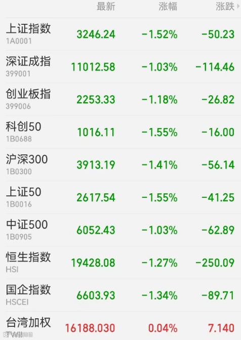 2、港股:港股小幅高开后震荡下挫,恒生指数收跌1.25%报19431.25点,恒生科技指数跌1.31%,恒生国企指数跌1.35%;大市成交863.8亿港元,南向资金净买入50.53亿港元。半导体、科技、有色、电力股走弱,中字头普跌,医药股逆市走强。