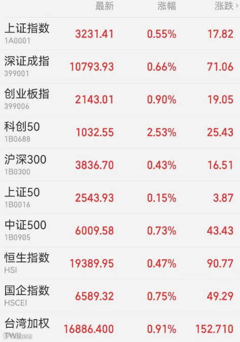 1、A股:A股企稳反弹,三大指数均收于日高,午后算力、CPO概念相继爆发,多只中字头尾盘集合竞价异动,全天仅地产、银行、家电等不多价值方向下跌。截至收盘,上证指数涨0.55%报3231.41点,深证成指涨0.66%,创业板指涨0.9%,北证50跌0.75%,万得全A、万得双创分别涨0.67%和1.38%。A股全天成交9910.5亿元;北向资金净卖出逾14亿元,翱捷科技、金山办公分别遭净卖出6.41亿元、5.22亿元,中国太保逆势获净买入9.69亿元。上周沪指涨0.04%,深成指跌1.86%,创业板指跌4.04%。
