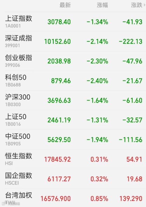 1、A股:外资持续抛售压制市场情绪,A股跳水收跌,CPO概念大跌,煤炭、环保股逆市走强。上证指数收跌1.34%,报3078.40点;深证成指跌2.14%,报10152.60点,创逾一年新低;创业板指跌2.30%,报2038.98点,创逾三年新低;科创50指数跌2.40%,北证50跌1.87%,万得全A跌1.77%,万得双创跌2.25%。A股成交额为7071.1亿元,北向资金大幅净卖出104.61亿元,连续13日“减仓”,贵州茅台遭净卖出8.51亿元居首,药明康德获净买入2.8亿元最多。
