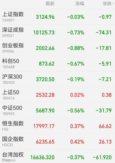 1、A股:A股早盘探底后回升,午后股指弱势震荡,市场情绪降至冰点,量能萎缩明显,成交金额创年内新低,近4000股下跌。上证指数收跌0.03%报3124.96点,深证成指跌0.73%,创业板指跌0.88%,科创50指数跌0.67%,北证50跌0.4%,万得全A跌0.54%,万得双创跌1.18%。市场成交额6359.3亿元,北向资金实际净卖出24.23亿元。