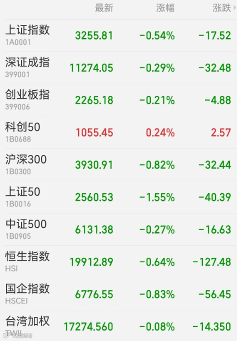 1、A股:A股震荡走弱,权重板块尽数低迷,AI+概念股活跃。截至收盘,上证指数跌0.54%报3255.81点,深证成指跌0.29%,创业板指跌0.21%,科创50涨0.24%,北证50跌0.71%,万得全A跌0.26%,万得双创涨0.65%。市场成交额1.1万亿元,连续4个交易日突破万亿元;北向资金实际净卖出14.47亿元,大华股份遭净卖出10.47亿元。