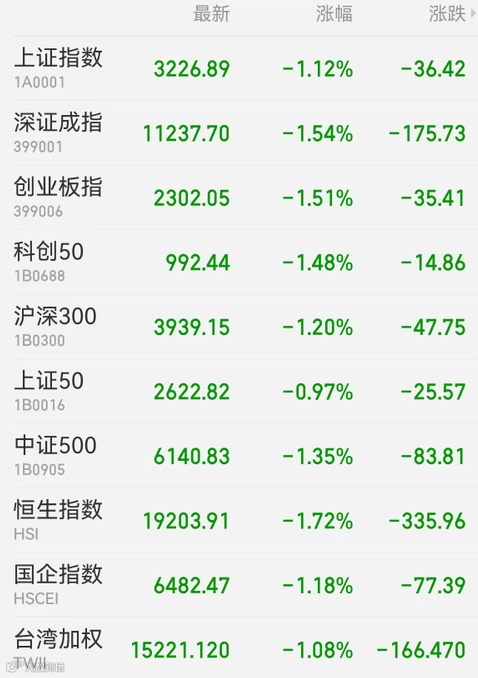 1、A股:A股单边下行,一带一路题材领跌,光伏、煤炭、石油、风能等新旧能源股齐下挫,锂电池指数回调明显;ChatGPT概念冲高回落,银行、中药板块逆势飘红。上证指数收盘跌1.12%报3226.89点,深证成指跌1.54%,创业板指跌1.51%,科创50指数跌1.48%,万得全A跌1.4%,万得双创跌1.57%。市场成交额8456.1亿元;北向资金实际净买入7.87亿元,中国平安遭净卖出9.17亿元。