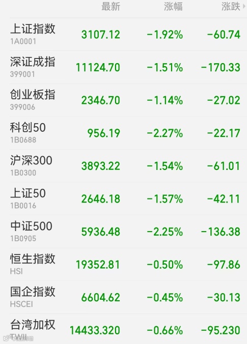 1、A股:A股低开低走,沪指盘中跌逾2%一度失守3100点,医药生物领跌,金融、消费、基建跌幅靠前;在线教育、锂矿、新能源车、东数西算、养老题材逆势走强。截至收盘,上证指数跌1.92%报3107.12点,深证成指跌1.51%,创业板指跌1.14%,科创50指数跌2.27%,万得全A跌1.87%,万得双创跌1.89%。市场成交额7573亿元,北向资金实际净卖出14.91亿元。