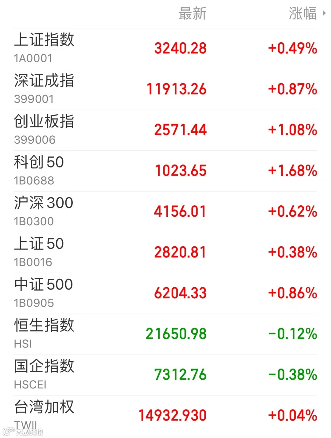 1、A股:A股震荡攀升,创业板指刷新阶段新高,市场人气有所升温,软件、券商、军工涨幅居前,CRO、信创、半导体题材活跃;大消费持续低迷。截至收盘,上证指数涨0.49%报3240.28点,深证成指涨0.87%,创业板指涨1.08%,科创50指数涨1.68%,万得全A涨0.67%,万得双创涨1.23%;市场成交额6874.4亿元。北向资金净买入93.93亿元,月内已累计加仓达1032亿元,创历史纪录;贵州茅台、招商银行、中国中免分别获净买入10.05亿元、9.07亿元、7.36亿元。