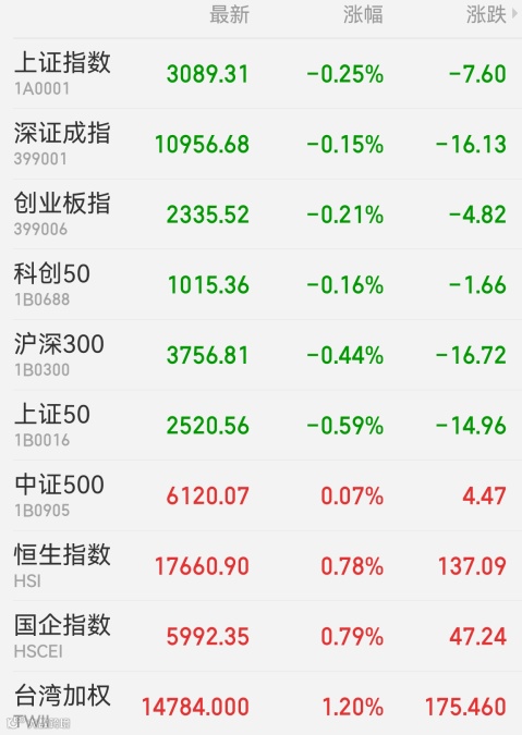 1、A股:A股呈现缩量整理态势,医药股重拾升势,地产表现不俗,大基建跌幅靠前,中字头、信创概念回调。截至收盘,上证指数跌0.25%报3089.31点,深证成指跌0.15%,创业板指跌0.21%,科创50指数跌0.16%,万得全A跌0.05%,万得双创涨0.1%。市场成交额7487亿元,创1个月新低;北向资金实际净买入12.36亿元。