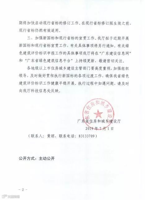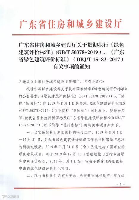 7月1日,广东省住房和城乡建设厅发布《关于贯彻执行《绿色建筑评价标准》(GBT 50378-2019)、《广东省绿色建筑评价标准》(DBJT 15-83-2017)有关事项的通知》,通知显示,2019年8月1日-12月31日,为我省绿色建筑评价标识工作执行国家新旧标准的衔接过渡期。2019年7月31日前(含)已通过施工图审查的绿色建筑项目,可于2019年12月31日前继续按旧国标申请绿色建筑评价标识。2020年1月1日起,我省不再受理按旧国标申请的绿色建筑评价标识项目。《通知》全文如下: