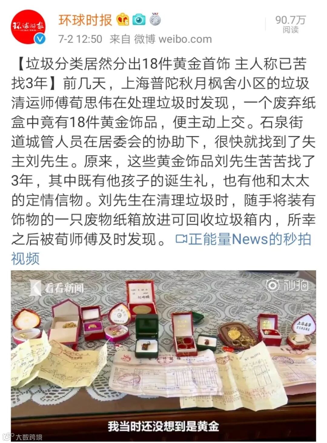 自从实行垃圾分类之后,找了三年都没影儿的18件黄金首饰终于被别人找到了。