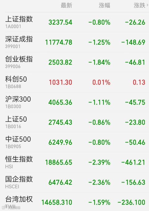 1、A股:A股三大指数大幅收跌,上证指数跌0.8%报3237.54点,深证成指跌1.25%,创业板指跌1.84%,科创50指数涨0.01%,万得全A跌0.98%,万得双创跌1.01%。市场成交额7232亿元,创逾4个月新低。题材股尽数回落,充电桩、锂电池、磷化工、风电、光伏、苹果指数跌幅靠前,券商、电力、化工、基建表现不振;海运、石油、零售、地产则逆市走强。中信建投证券表示,当前A股估值处于历史偏低位,对中期走势不必过于悲观,投资者可耐心等待市场探底企稳。