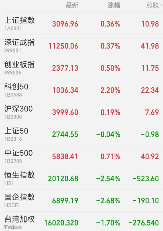 1、A股:A股低开高走,三大股指尾盘全面翻红,上证指数收盘涨0.36%报3096.96点,创业板指涨0.50%报2377.13点,深证成指涨0.37%报11250.06点;大市成交0.81万亿元。盘面上,风电、光伏携手大涨,房地产、半导体、特高压、储能纷纷造好,大基建央企板块午后发力,汽车板块翘尾。猪肉、食品、油气、白酒、保险、银行板块休整。