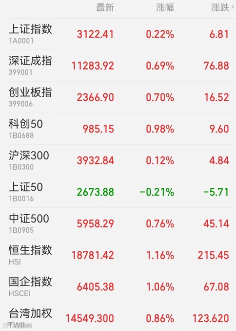 1、A股:A股震荡攀升,沪指止步四连跌,创业板指一度涨超2%。题材股呈现普涨格局,光伏、锂电池引领赛道股反弹,汽车零部件板块掀涨停潮,零售股反复活跃;金融、地产则表现不振。市场成交额进一步萎缩至6520.3亿元。截至收盘,上证指数涨0.22%报3122.41点,深证成指涨0.69%,创业板指涨0.7%,科创50指数涨0.98%,万得全A涨0.72%,万得双创涨1.08%。