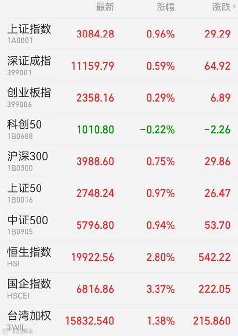 1、A股:上证指数全天强势震荡,收盘涨0.96%报3084.28点,录得五连阳;创业板指获宁德时代力挺,收盘涨0.29%报2358.16点;深证成指涨0.59%报11159.79点;大市成交0.76万亿元。盘面上,汽车板块火爆,长城汽车、长安汽车、小康股份、江铃汽车等封板,比亚迪涨超6%。房地产股火力全开,世联行等20余股涨停。煤炭、海运、港口、工业机械、电力、金融板块造好。农业、抗疫、食品板块调整。
