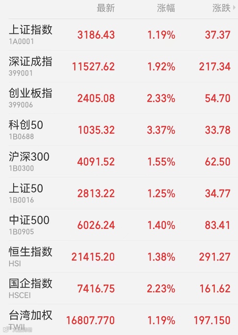 1、A股:上证指数报3186.43点,上涨1.19%,成交额4325.28亿。深证成指报11527.62点,上涨1.92%,成交额5036.94亿。创业板指报2405.08点,上涨2.33%,成交额1588.35亿。总体上个股涨多跌少,两市超3300只个股上涨。两市合计成交额9362亿,较上个交易日放量1251亿。盘面上,种植业和林业、科创板次新、消费电子、乳业等板块涨幅居前,汽车整车、煤炭开采、教育、新型城镇化等板块跌幅居前。