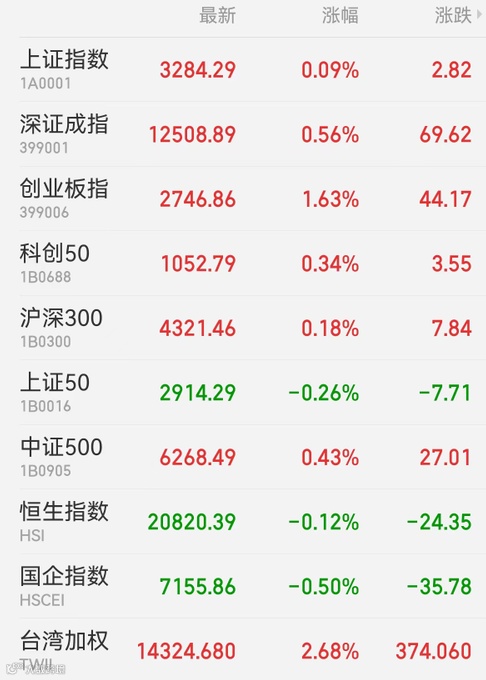 1、A股:沪深两市全天走势分化,新能源强势反弹助力创业板指,多地高温下电力板块成最大赢家。截至收盘,上证指数微涨0.09%报3284.29点,深证成指涨0.56%报12509.89点,创业板指涨1.63%报2746.86点,万得全A涨0.53%报5211.14点,万得双创涨1.28%报2879.62点;大市成交仅9426亿元。盘面上,风电、光伏、储能等新能源赛道股全天强势,宁德时代百亿成交大涨7%;充电桩、特高压、虚拟电厂、锂电等细分赛道涨势明显,核电、水电、火电等多个行业涨声一片。银行股单边走弱,并拖累保险、券商板块;资源股多数被期市带动下挫。