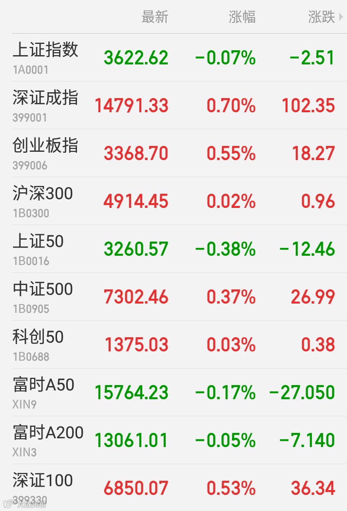 1、A股:上证指数全天窄幅震荡为主,创业板、深证成指高位横盘。截至收盘,上证指数跌0.07%报3622.62点,深证成指涨0.7%报14791.33点,创业板指涨0.55%报3368.7点,万得全A涨0.3%。两市成交额连续第44个交易日超过1万亿元。盘面上,地产板块回调,天房发展、南国置业触及跌停。金融、钢铁、海运、电力板块疲软。苹果、网游、互联网股涨势强劲,半导体、农业板块造好,中药板块持续上攻。