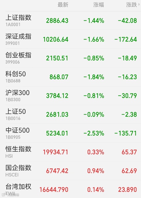 1、A股:沪深三大股指早盘探底回升,创业板指一度涨超2%;午后券商板块急转直下,多头再度溃散,沪深三大股指续创阶段新低。截至收盘,上证指数跌1.44%报2886.43点,创业板指跌0.85%报2150.51点,深证成指跌1.66%报10206.64点;大市成交0.84万亿元。盘面上,券商板块跌超4%,南京证券等7家券商封住跌停,中信建投触及跌停。军工、煤炭、软件、农业、电脑硬件板块领跌大市,纺织服装股出现跌停潮。锂电池、光伏、风电、苹果、国家大基金指数跌势未止,年内均跌超40%。白酒、基建、餐饮旅游板块逆市造好。
