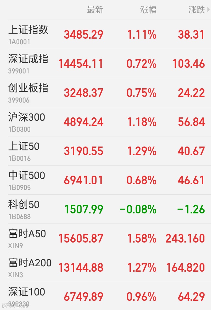 1、A股:沪深两市早盘震荡整固后下午大幅攀升,大金融板块强势爆发,券商股全线井喷,赛道股为主的创业板指午后则明显掉队,市场沿着高切低和中期业绩两大变量继续演绎。上证指数收涨1.11%报3485.29点,深证成指涨0.72%,创业板指涨0.75%。两市成交1.19万亿元,连续21个交易日破万亿。