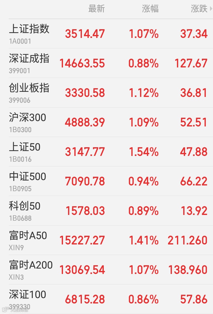 1、A股:沪深两市高开后震荡攀升,午后高位横盘。大宗商品强劲涨价潮下周期股继续向上,券商、白酒等权重板块表现不俗,全天市场题材较为混乱且涨势零散。上证指数收涨1.07%报3514.47点,深证成指涨0.88%,创业板指涨1.12%报3330.58点,科创50涨0.89%。万得全A涨0.96%。两市放量成交1.41万亿元,创8月3日以来新高。