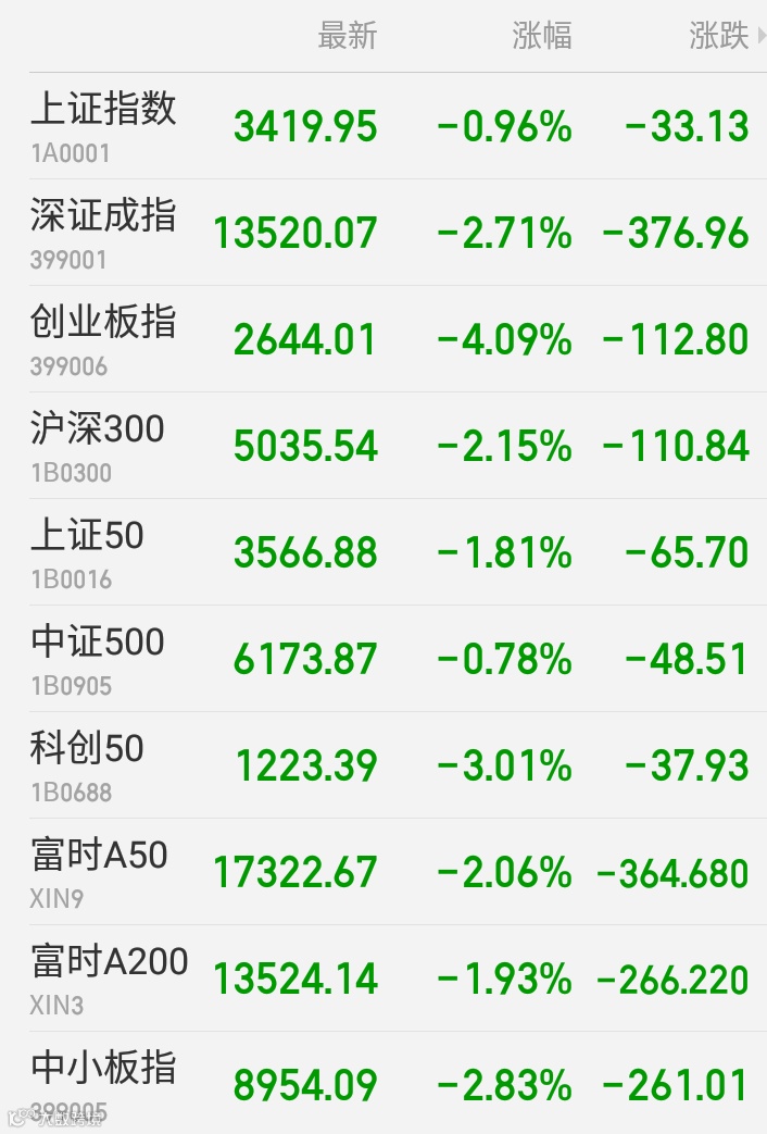 1、A股:上证指数报3419.95点,下跌0.96%,成交额3816.46亿。深证成指报13520.07点,下跌2.71%,成交额4253.59亿。创业板指报2644.01点,下跌4.09%,成交额1351.73亿。两市合计成交8070.06亿。盘面上,旅游酒店、机场航运、化工等板块涨幅居前,超级品牌、半导体、证券等板块跌幅居前。