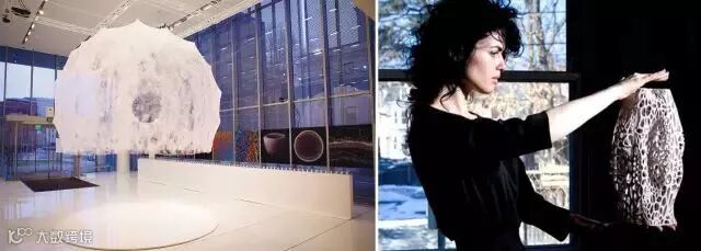 左图:Neri Oxman模仿桑蚕织茧,3D打印的丝网艺术品