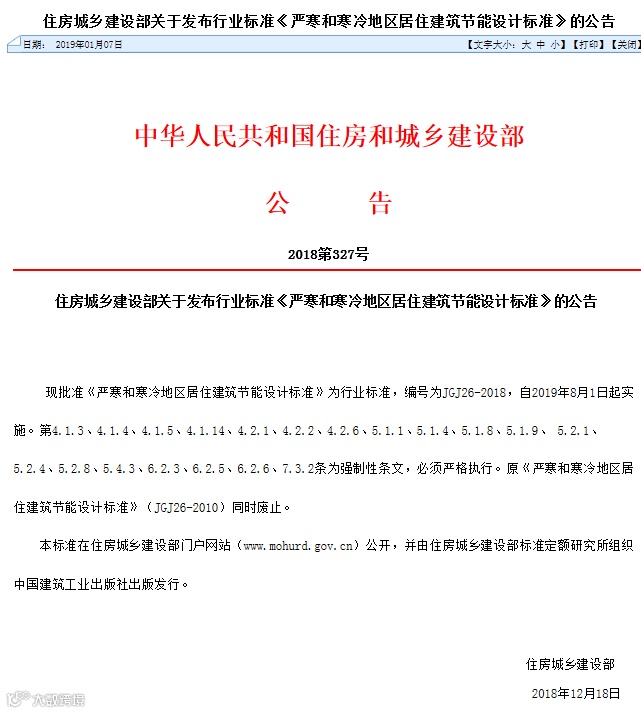 2019年1月7日,住房城乡建设部发布了“关于发布行业标准《严寒和寒冷地区居住建筑节能设计标准》的公告”。《严寒和寒冷地区居住建筑节能设计标准》(JGJ26-2018)自2019年8月1日起实施。原标准《严寒和寒冷地区居住建筑节能设计标准》(JGJ26-2010)同时废止。