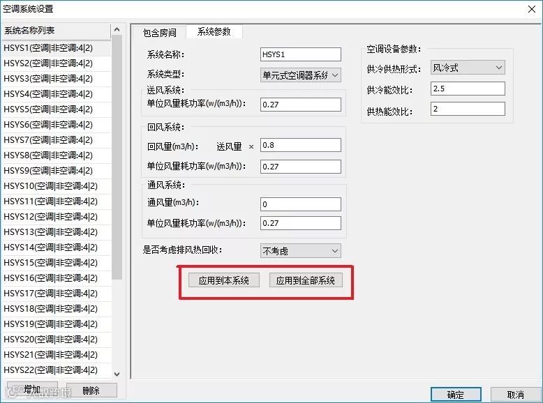 暖通空调-系统设置,在系统参数设置了增加了“应用到本系统”、“应用到全部系统”两个按钮,如下图1所示。
