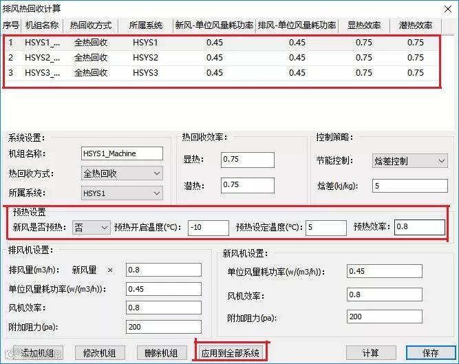 排风热回收的系统个数与“系统设置”—“系统参数”里是否考虑热回收系统里选择“考虑”的系统进行了联动。这样对于排风热回收系统多的建筑,可以简化排放热回收的设置,节省时间。