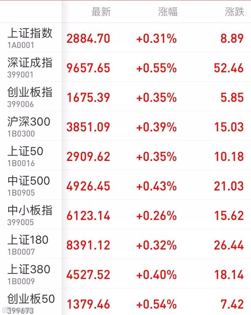 1、A股:探底回升,呈现V型走势,新能源汽车产业链概念大涨。上证指数涨0.31%报2884.70点,录得二连阳;深证成指涨0.55%;创业板指涨0.35%,一度跌逾1%。两市成交3471亿元,较上日基本持平。北向资金净流入34.57亿元,连续14日净流入。格力电器获净买入9.63亿元,创11月1日以来新高,中国平安、长春高新分别净买入2.31亿元、2.24亿元。